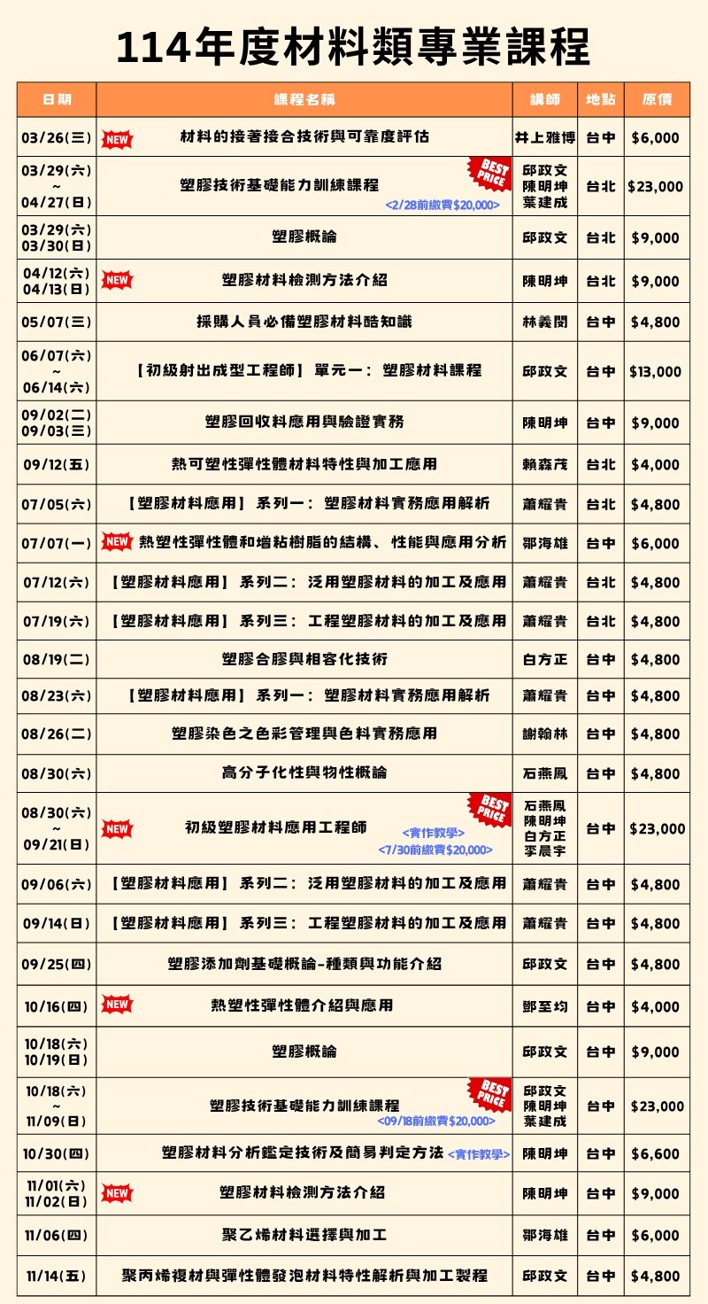 2025-07-30 塑膠中心🌟【114年度材料類專業課程 全新開跑】🌟 台中工業區塑膠中心,114年度課程,總經理 鄧至均 博士 於10/16開課,歡迎一起共襄盛舉。📚 從入門到進階,從理論到應用,讓您掌握材料科學與塑膠技術的最新趨勢!114年課程表如下。 BACK